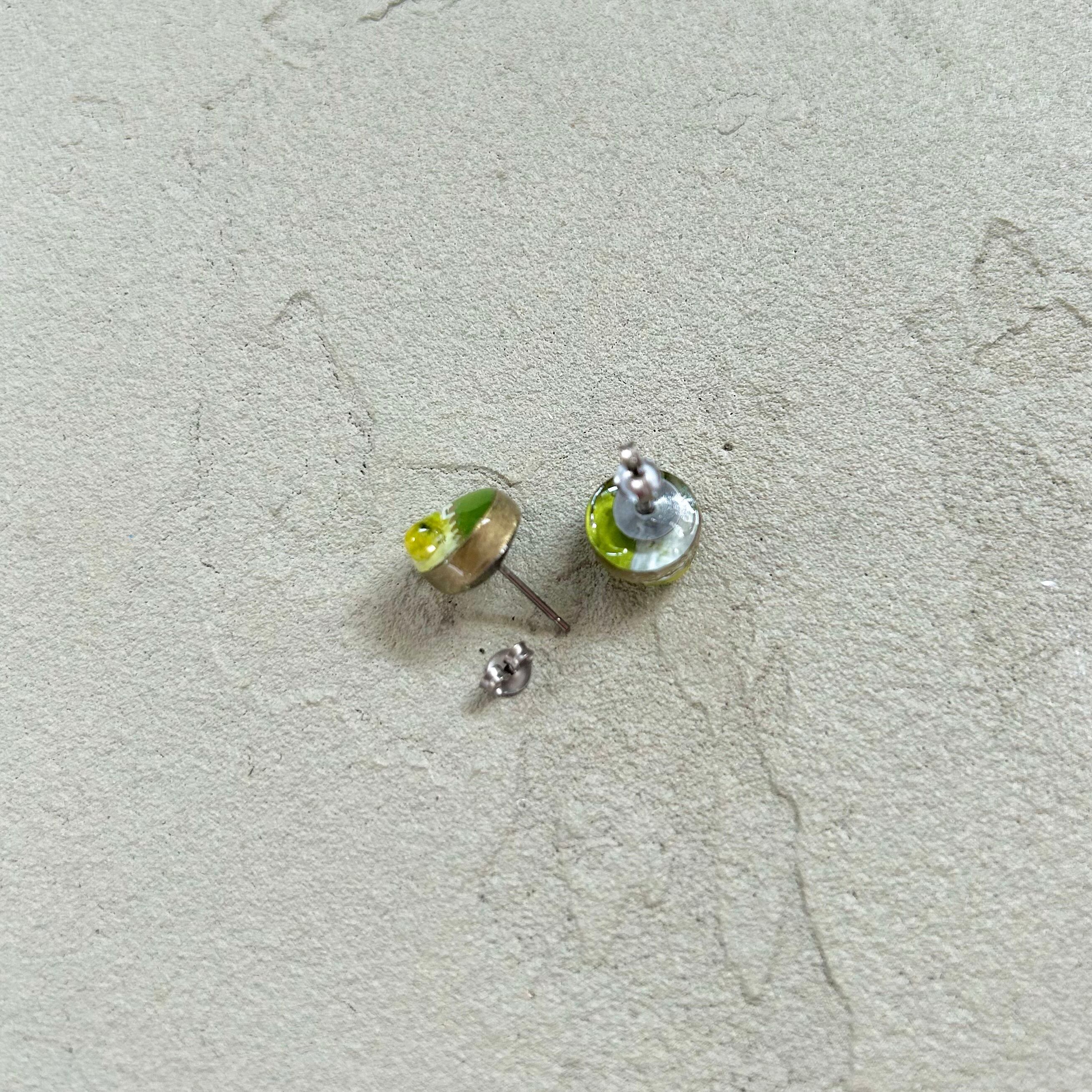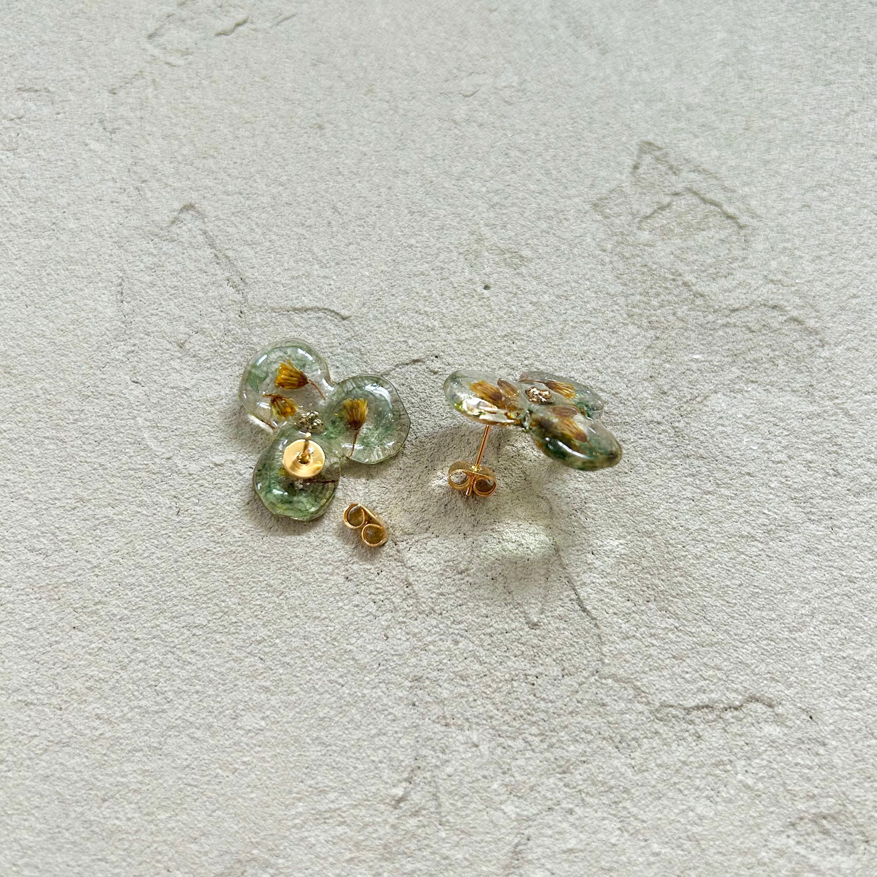 "ボタニカルシリーズ" まん丸3peaceピアス。 様々な草花を敷き詰め、層になっています。光に当たるとガラスのような質感に。 ピアス素材は 錆びにくく、アレルギー症状の出にくい サージカルステンレスでのご用意となります。 (医療用316L)