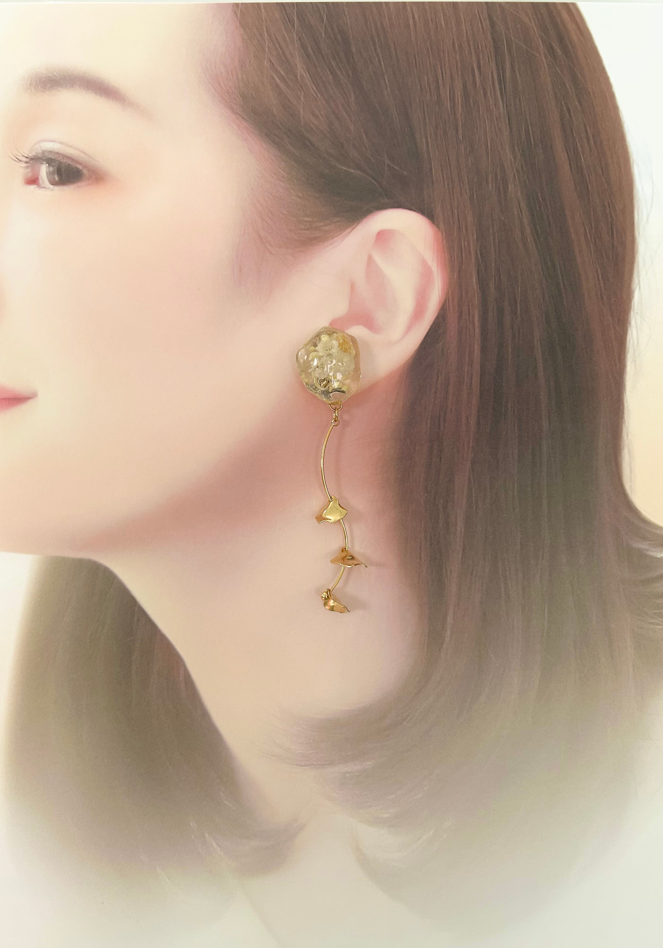 "ボタニカルシリーズ" ユーカリの色合いが柔らかな雰囲気と、 こなれた印象を与えるデザイン。 イヤリング金具は調節ができるネジバネイヤリングです。(メッキ処理 ニッケルフリー)